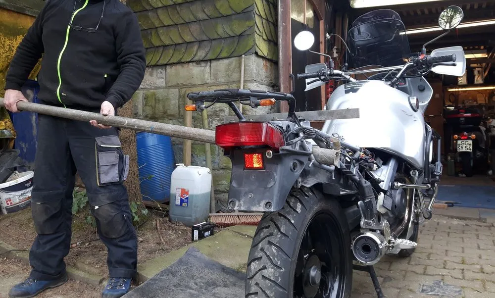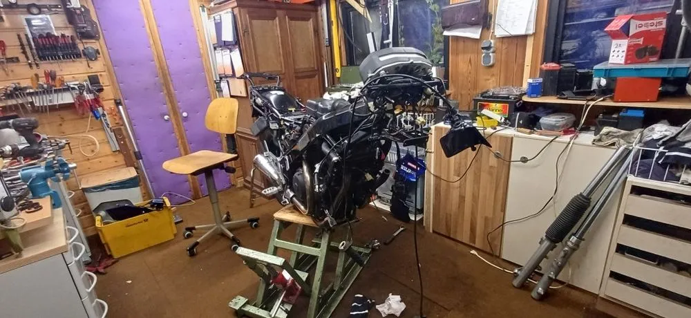 Da die Gabel (rechts im Bild) völlig krumm ist habe ich diese komplett mit Brücken ausgebaut. Da der Hauptrahmen nicht sichtbar beschädigt worden ist, außer an den Stellen wo die Aufhängungen für die Sturzbügel saßen,