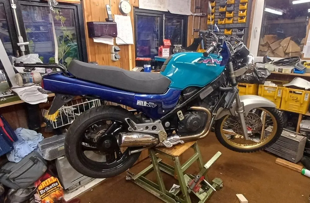 Eine Guzzi fürn Alltag, eine Transalp fürn Gelände und im Winter, eine Gummikuh für die Fernreise und meine kleine Nixe, die NX250 als Stoppelhopser hinten auf meinem Bulli.