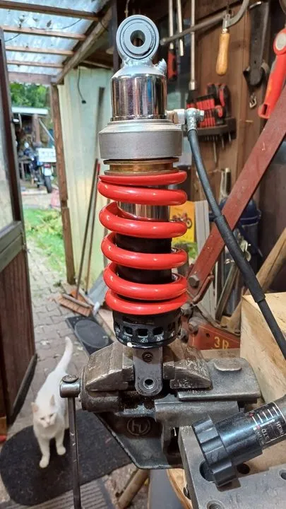 Dann blieb unten die K1200RS Mechanische Federvorspannungsmechanik dran, darüber die passende YSS- Feder, und darüber von der NTV der Hydraulische Showa- Federvorspanner, den ich vorher entlüftet hatte. Das konnte ich wiederum alles selber machen und passt hervorragend zusammen!