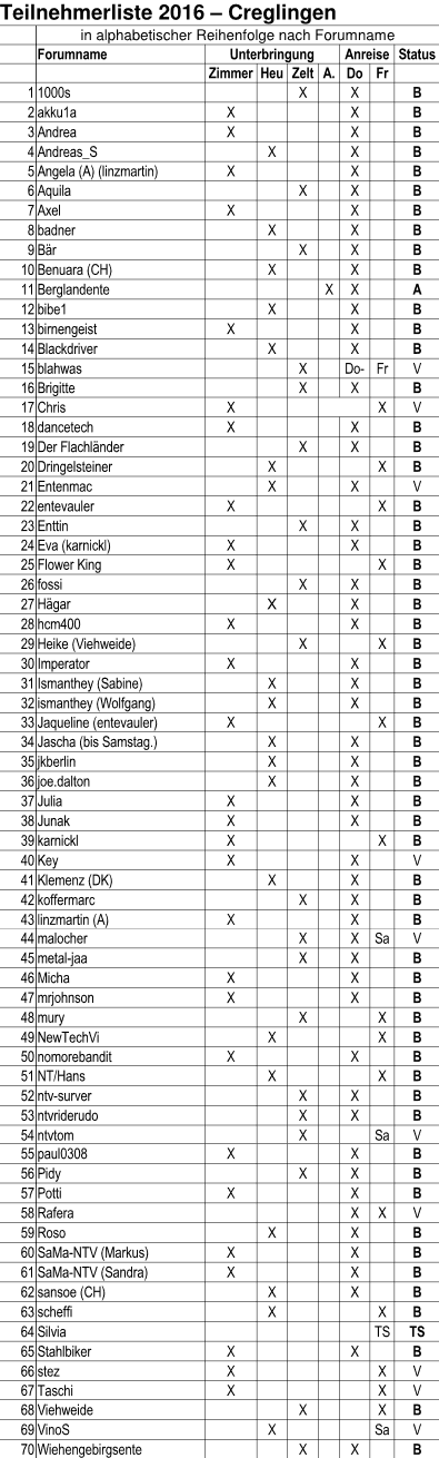 StatusV = vorgemerkt, B = bezahlt, A = AuswärtsschläferT = Tagesgast, TS = Tagesgast Samstag